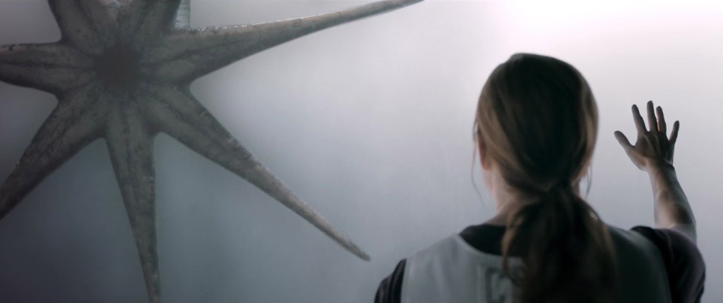 Một chi tiết cực kỳ quan trọng khiến tôi thật sự nể phục tác giả Ted Chiang, đạo diễn Denis Villeuneuve và biên kịch Eric Heisserer đó chính là khi Louise cố gắng vẽ logogram trên tấm kính để giao tiếp với Abbott, cô nói với Ian rằng “Tôi không viết được bằng cả hai tay”. Vì sao lại như vậy? Nếu nghĩ theo cách thông thường của chúng ta, vẽ một vòng tròn lớn trên tấm kính bằng hai tay sẽ nhanh và dễ hơn rất nhiều. Nhưng vốn dĩ Abbott không cho phép Louise thực hiện điều đó cả về mặt ý thức lẫn thể chất. Cô chỉ có thể vẽ nửa vòng tròn sau khi Abbott cho cô thấy giây phút mình có con, và Abbott vẽ nửa vòng tròn còn lại. Cảnh phim này có 2 ý nghĩa.