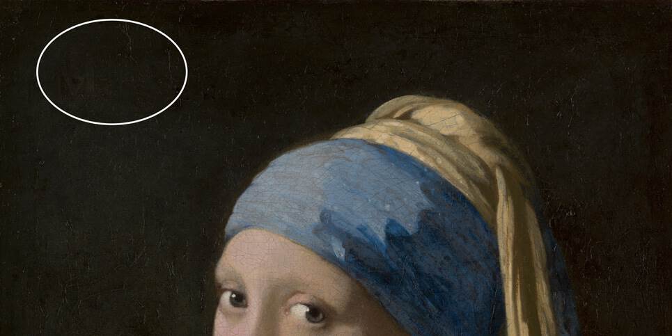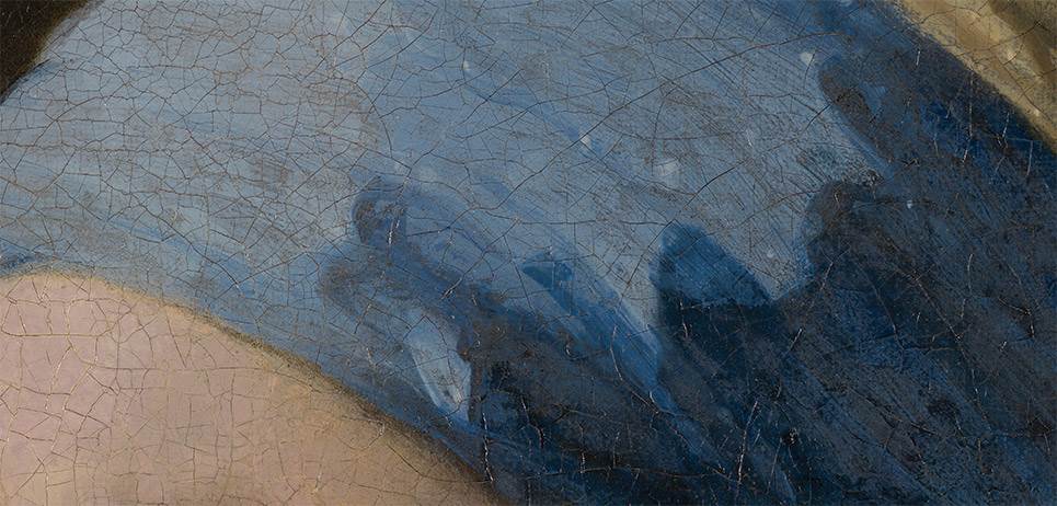 Trong quá trình phục chế, các chuyên gia phát hiện ra rằng nền đen của bức tranh ban đầu có màu xanh đậm như men. Các mặt cắt ngang và kiểm tra dưới kính hiển vi cho thấy Vermeer đã xây dựng lớp nền này qua nhiều lớp. Đầu tiên, ông phủ một lớp màu đen có chứa bột than đen (charcoal). Sau đó, ông sơn một lớp men màu xanh lá cây chứa màu chàm (indigo) và màu vàng (weld). Tuy nhiên, các sắc tố hữu cơ của hai màu này đã phai màu theo năm tháng.